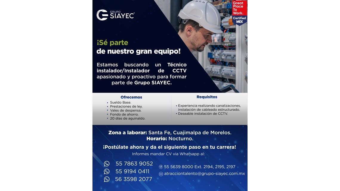 Grupo Siayec, SA de CV está buscando un Técnico Instalador para unirse a nuestro equipo.